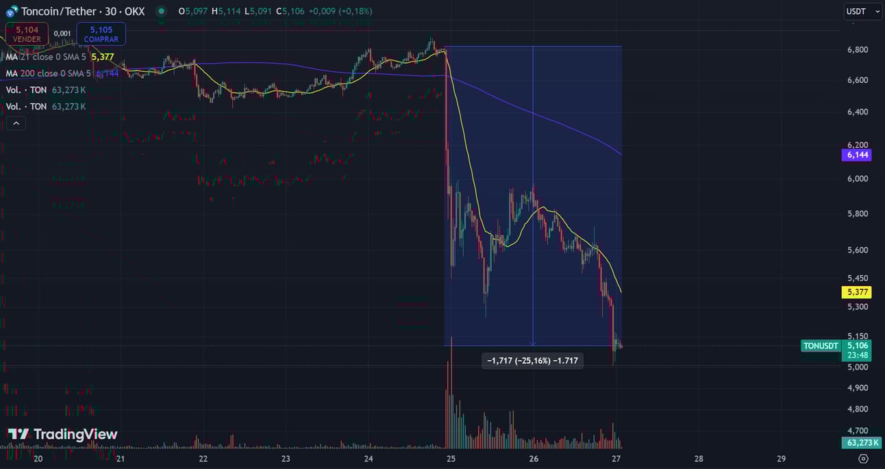 Además esta noticia a provocado una caída de la criptomoneda TON , o The Open Network, es una blockchain descentralizada de alta velocidad y escalabilidad, diseñada para soportar millones de transacciones por segundo. Fue creada por los fundadores de Telegram, Pavel y Nikolái Dúrov, en 2018. Más contexto en este breve hilo de X. Hasta el momento TON acumula una caída del 25%