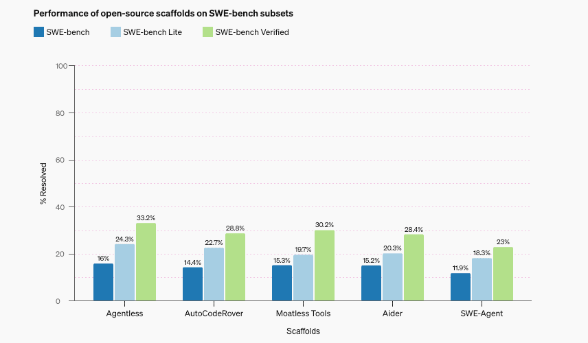 En SWE-bench Verified, GPT-4o detecta el 33,2 % de las muestras, y el mejor andamio de código abierto, Agentless, duplica su puntuación anterior al 16 %.