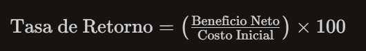 La fórmula de la tasa de retorno calcula el beneficio neto total que un inversor obtiene de un activo. Se calcula y se muestra como un porcentaje del costo inicial total del activo. Esencialmente, se está calculando el cambio porcentual desde el inicio hasta el final de una inversión. La fórmula es la siguiente: