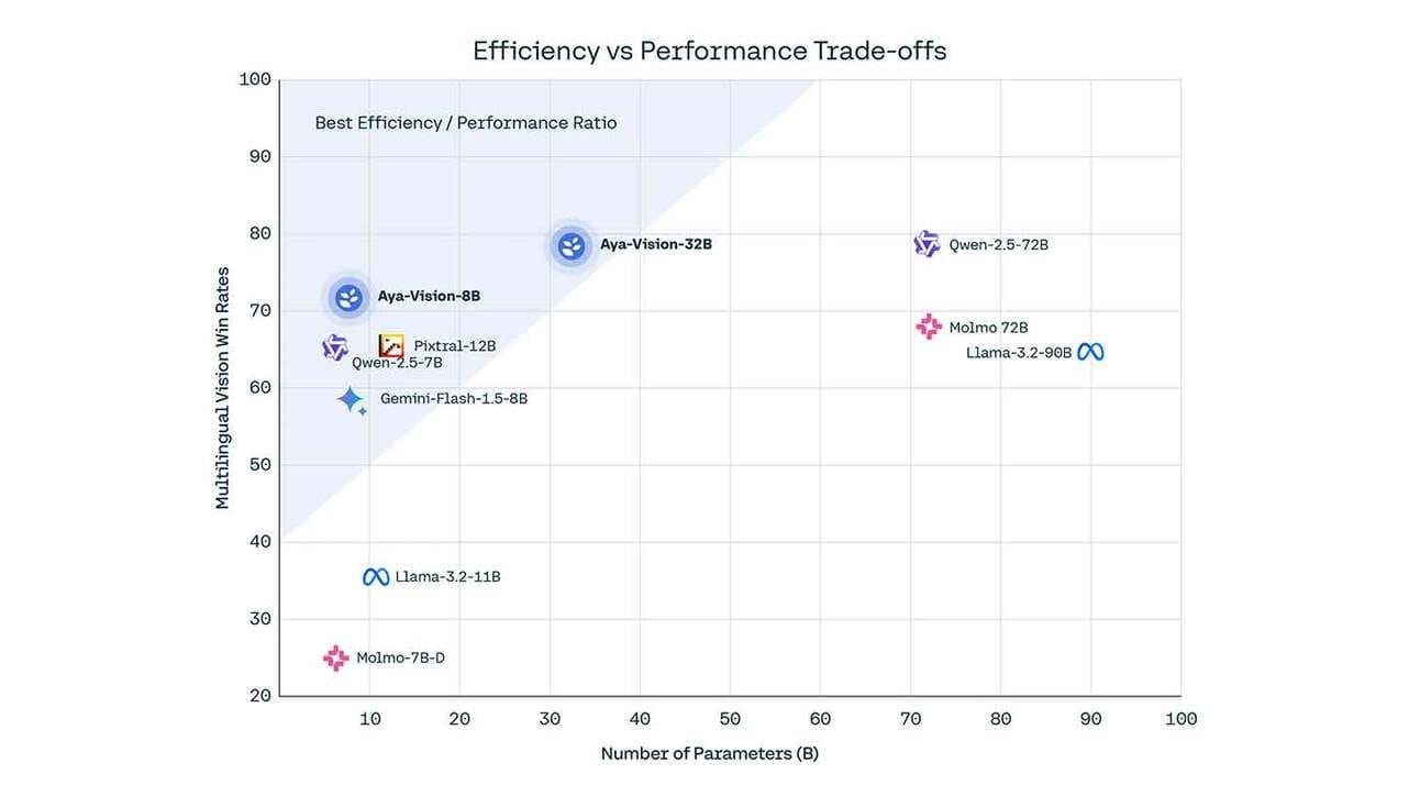 Aya Vision viene en dos tamaños: la versión 8B supera a rivales 10 veces su tamaño y la 32B supera a los de más del doble de tamaño, como Llama-3.2 90B Vision.