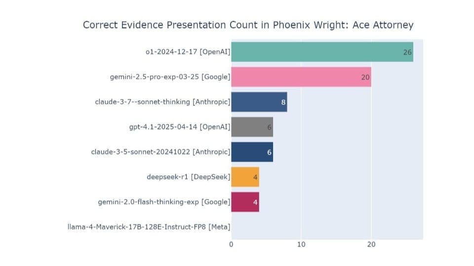 El equipo encargó a los mejores modelos, incluido GPT-4.1, que jugaran como Phoenix, quien debe identificar lagunas en el caso haciendo coincidir las declaraciones de los testigos y las pruebas.
