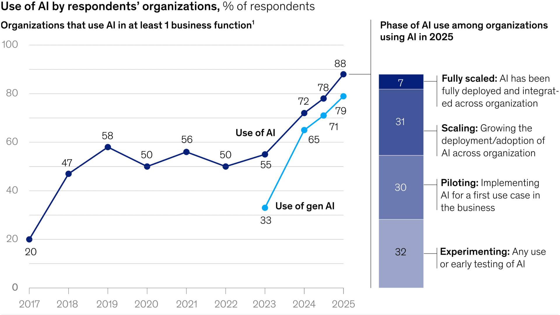 McKinsey publicó su encuesta Estado de la IA 2025, realizada a casi 2000 organizaciones, que revela que, si bien casi todas las empresas utilizan actualmente IA, la mayoría se encuentra estancada en proyectos piloto, y solo una fracción logra un impacto en toda la empresa o agentes de escalado.