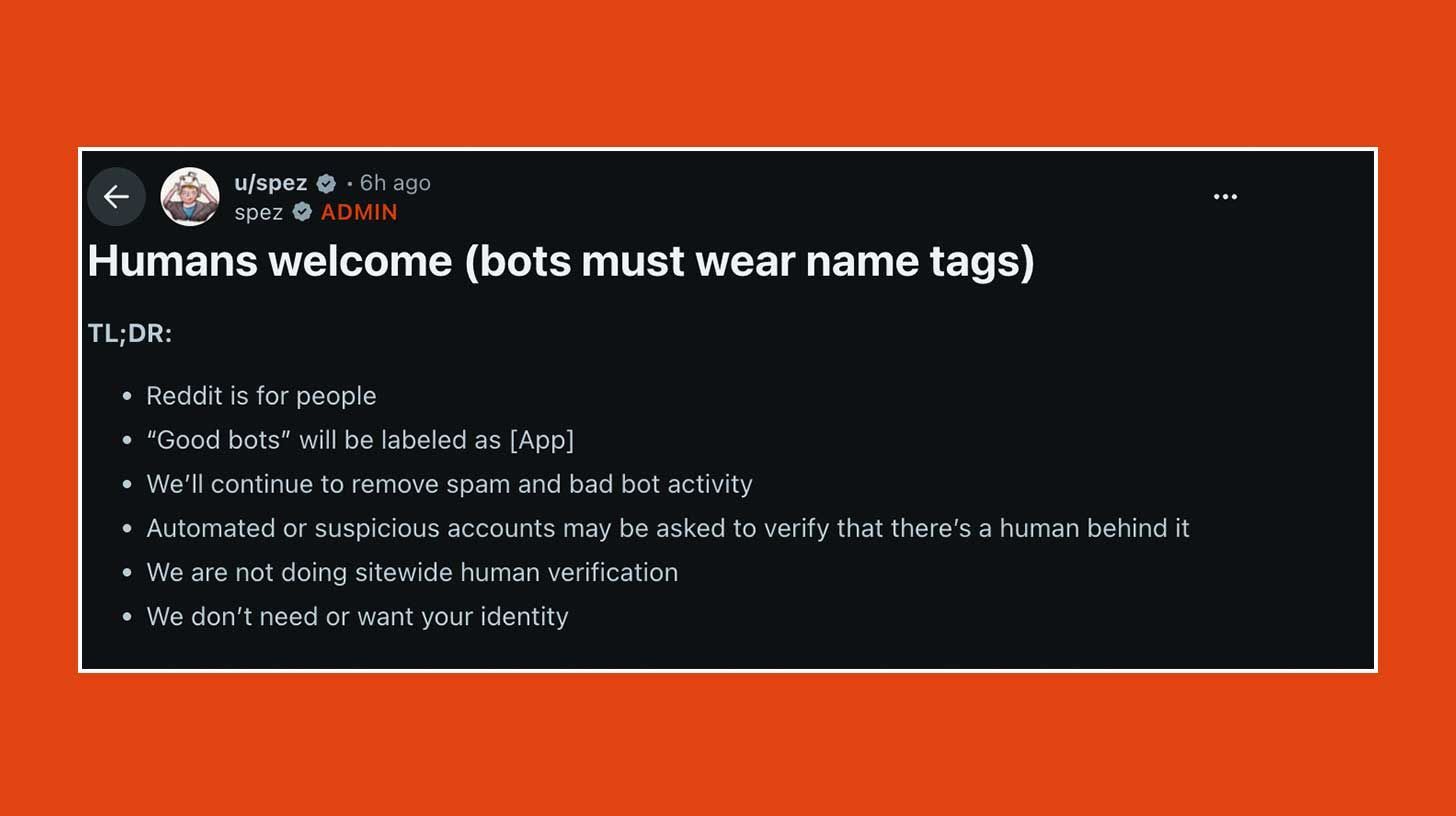 El director ejecutivo de Reddit, Steve Huffman, describió un plan para separar a los humanos de los bots en todo el sitio, que incluye etiquetar las cuentas automatizadas, señalar a los usuarios sospechosos para su verificación y permitir que las subcomunidades se autorregulen sin controles de identidad masivos.
