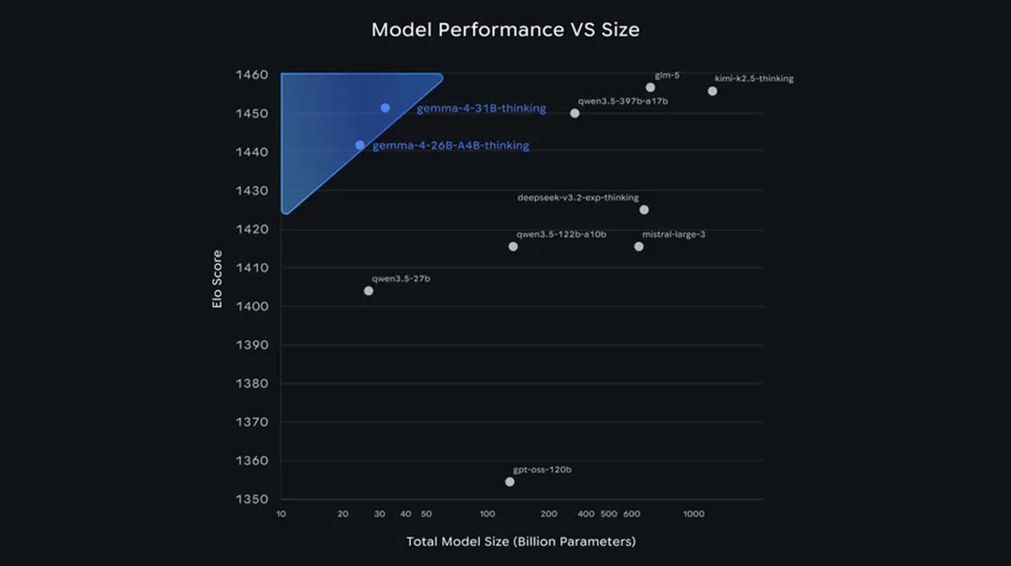 Los modelos 31B y 26B de Gemma 4 se sitúan cerca de sus rivales, como Kimi K2.5, GLM-5 y Qwen 3.5, en términos de inteligencia, a pesar de tener un tamaño mucho menor.