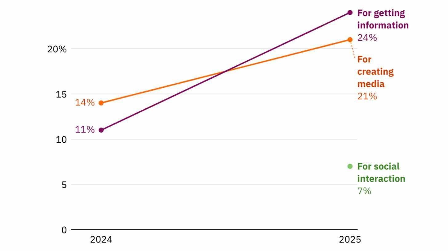 La búsqueda de información se informó como el nuevo caso de uso dominante, con un 24 % que utiliza IA para investigación y preguntas, en comparación con el 21 % para generar texto, imágenes o código.